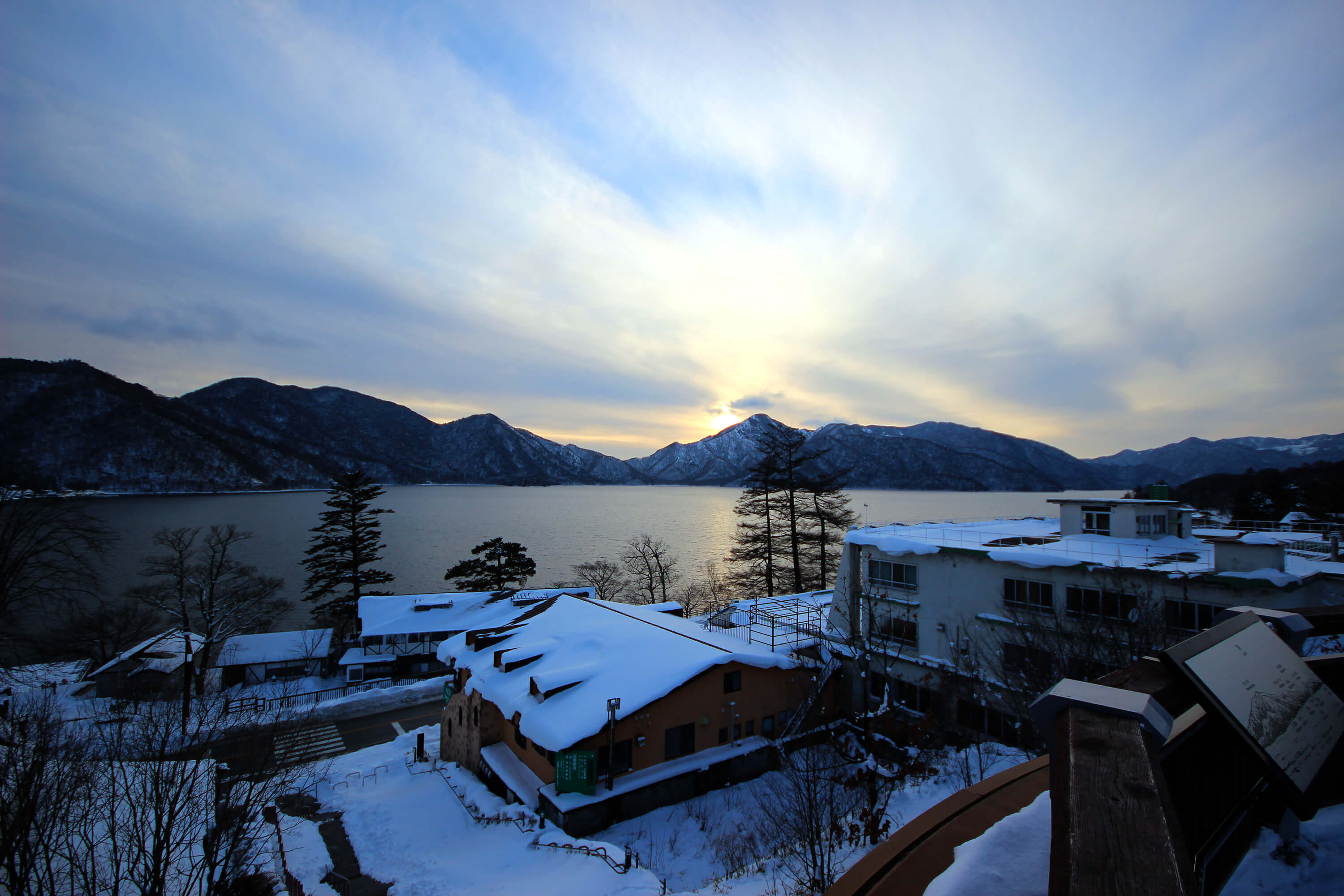 中禅寺湖冬夕日日光湖社山雪雪山